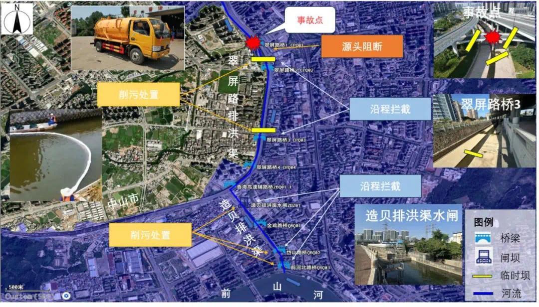 演练模仿12月16日上午10时许,一辆载有20吨柴油的罐车在S34香海高速跨翠屏路排洪渠路段(g113.513347,22.264463)产生交通事端,致约1吨柴油走漏进入翠屏路排洪渠。事端走漏点间隔前山水道约3.81公里。事态紧迫,需赶快处置。